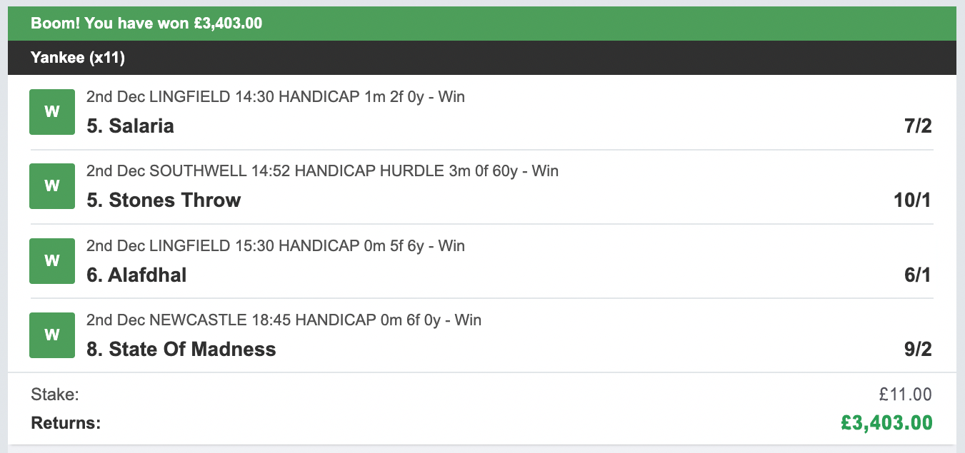 Just last month I made a profit of £4,639.08! from £1 stakes (£11 total daily bet)!